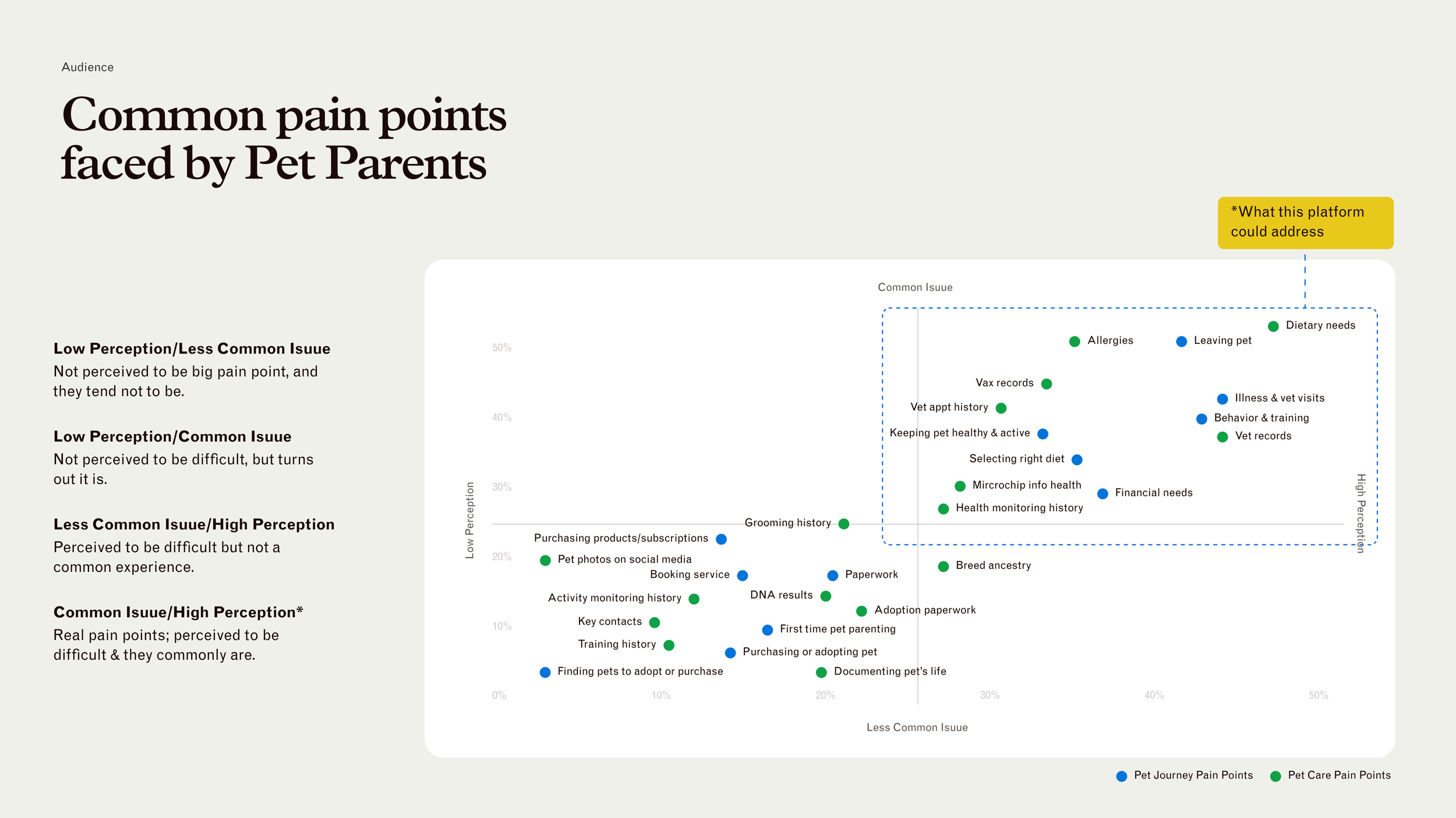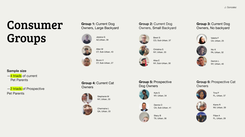 We reviewed existing research and insights from our Mars Petcare research database and our Kinship sister brands (GoodFriend, Wisdom Panel, Whistle, The Wildest, Adopt-a-Pet, and PetExec ) to inform our user personas, Pet Parent archetypes, potential product features & services, and our product roadmaps. From there, our team created prioritized use cases and scenarios.